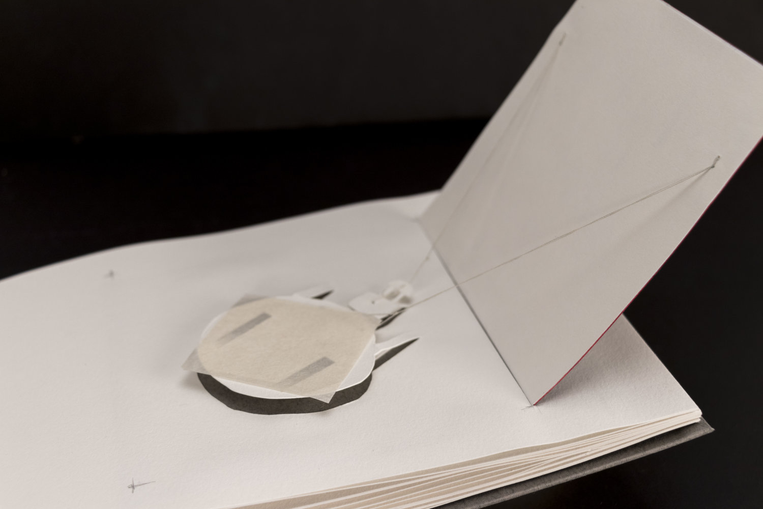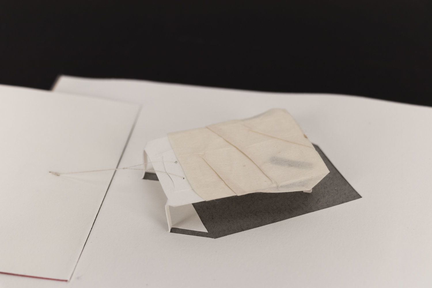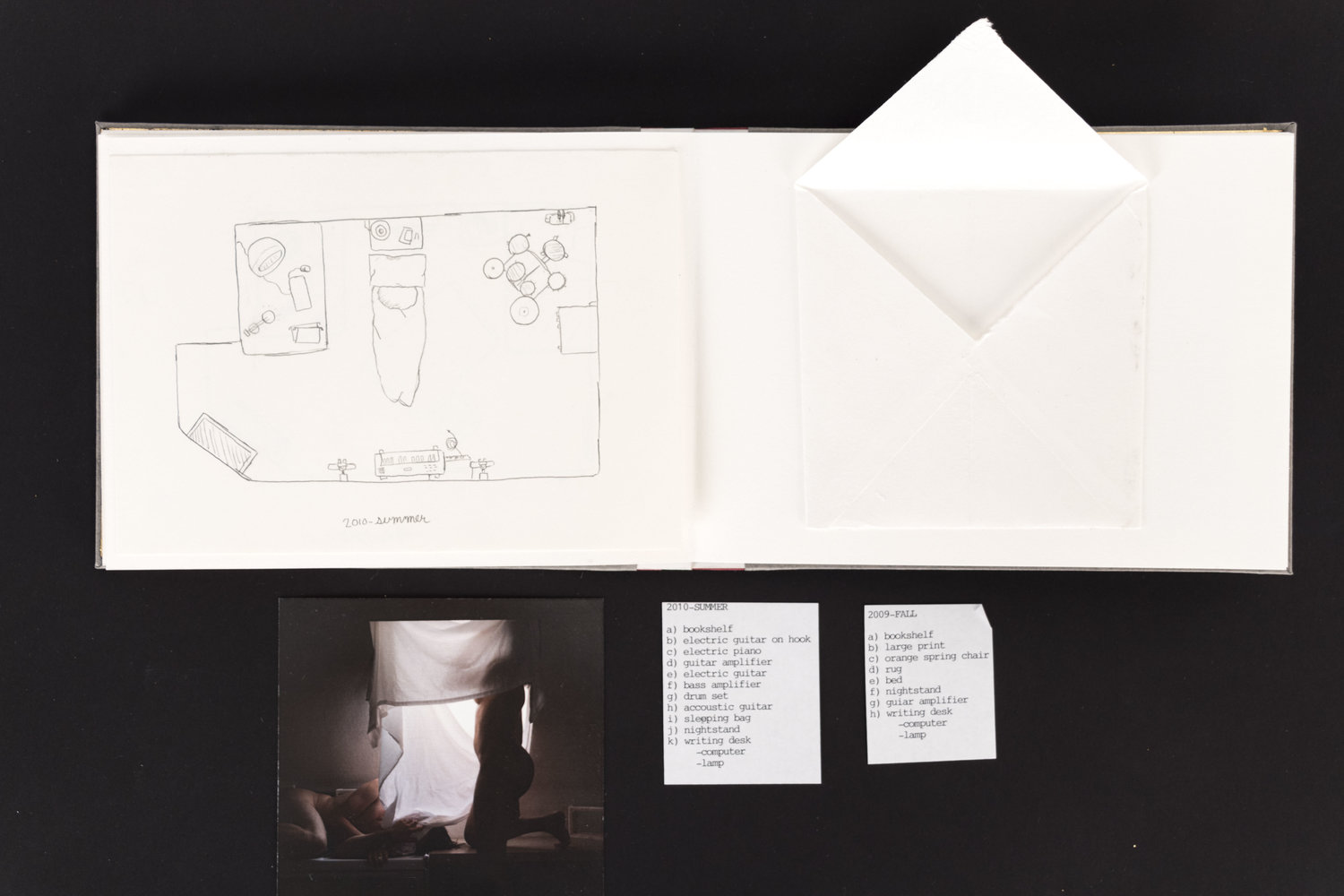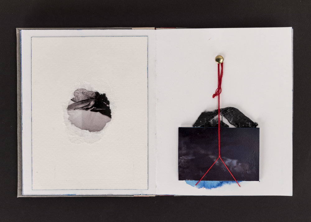 Findings was a collaborative installation with photographer David Dunsmoor. The work consisted of four hand-made books laid around a table. Guests were invited to sit and look through the books. Across from the table, a large, fabric cube with a floating bedroom suspended inside hung from the ceiling.